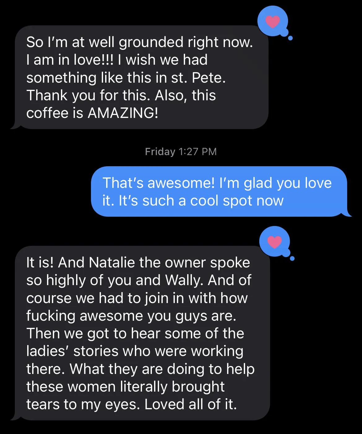 (Here's a screenshot of a text we received from a friend who visited Well Grounded Coffee in Dallas earlier this year...)