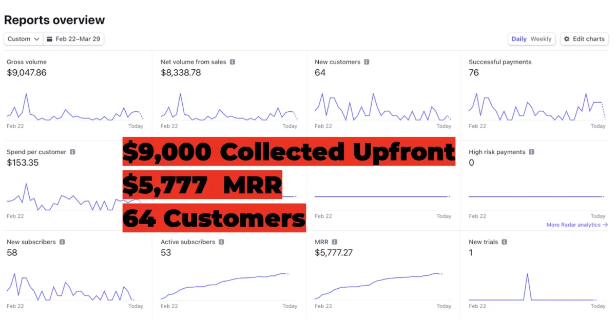 (Here's the Stripe Dashboard showing $9,000+ cash collected and $5,777 in monthly recurring revenue ...)